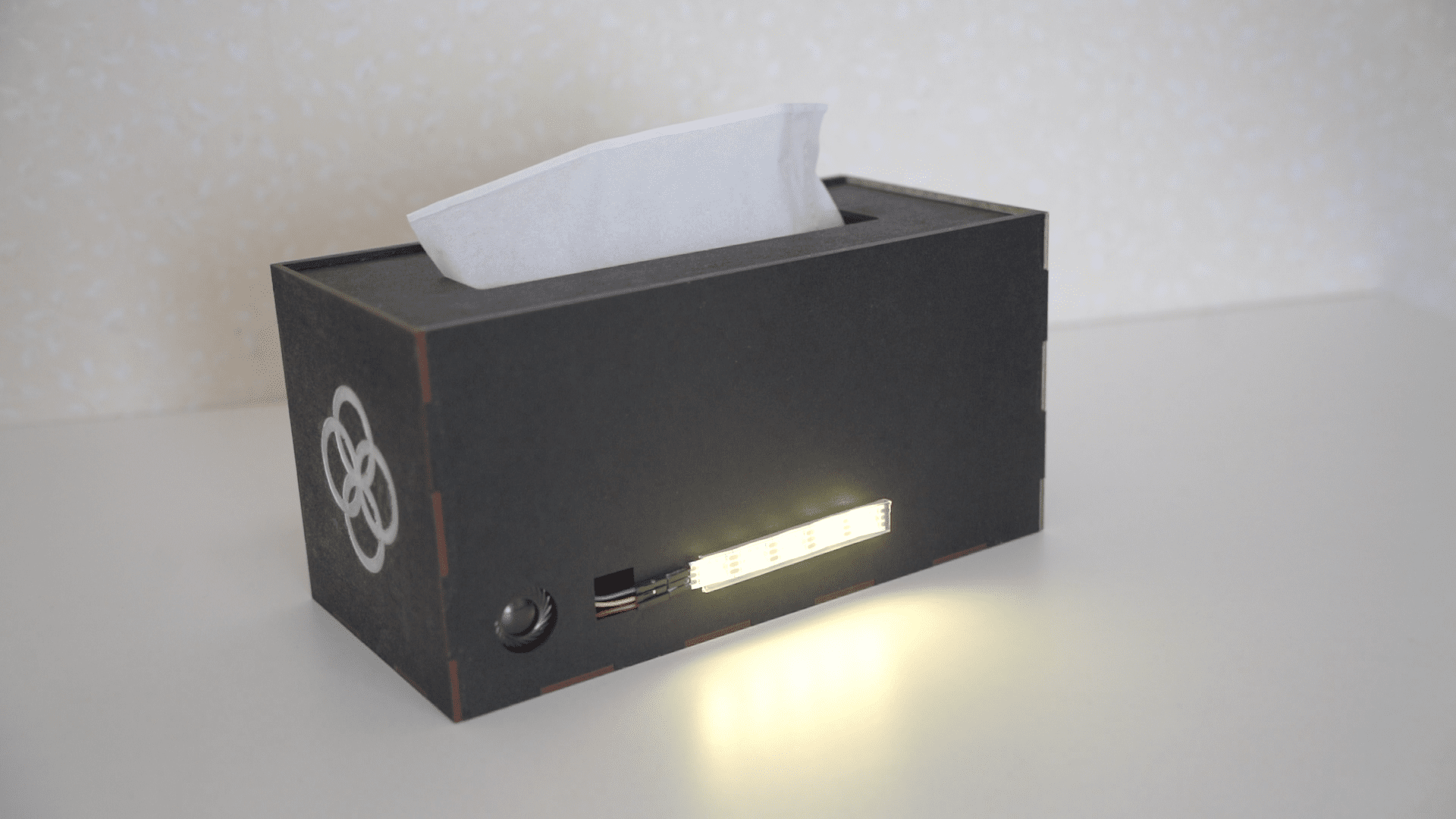 ケースの中にティッシュを入れて使用します。ティッシュの枚数が少なくなると内蔵された光センサが反応し、音と光で知らせてくれます。